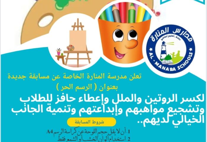 تعلن مدارس المنارة الخاصة عن مسابقة جديدة للتربية الفنية بعنوان : (الرسم الحر ) لموهوبين المنارة ،هدفنا اكتشاف المواهب والارتقاء بها لأعلى مستوى 👏🎨❤️